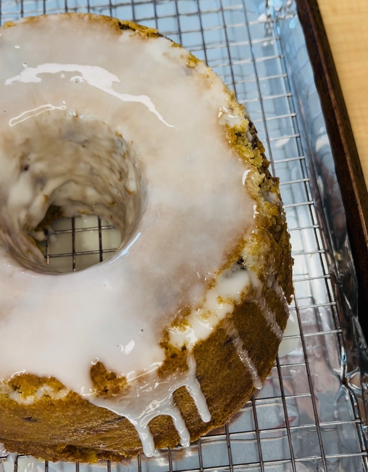 Cool the cake on a lined sheet pan with a metal rack. Make the glaze by combining the icing sugar and remaining milk with a whisk.